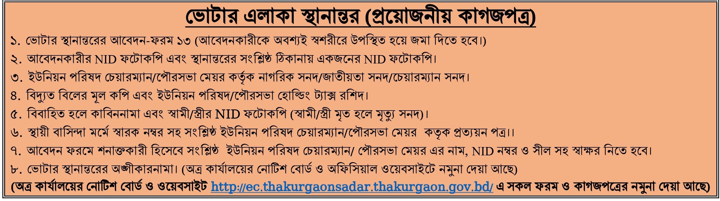 | নির্ধারিত “ফরম-১৩” এর মাধ্যম সংশ্লিষ্ট উপজেলা নির্বাচন অফিসার (যে এলাকায় আসতে ইচ্ছুক) বরাবর আবেদনপত্র দাখিল করতে হবে। আবেদনকারীকে স্বশরীরে সংশ্লিষ্ট উপজেলা নির্বাচন অফিসারের কার্যালয়ে স্বশরীরে উপস্থিত হয়ে আবেদনপত্র দাখিল করতে হবে। |